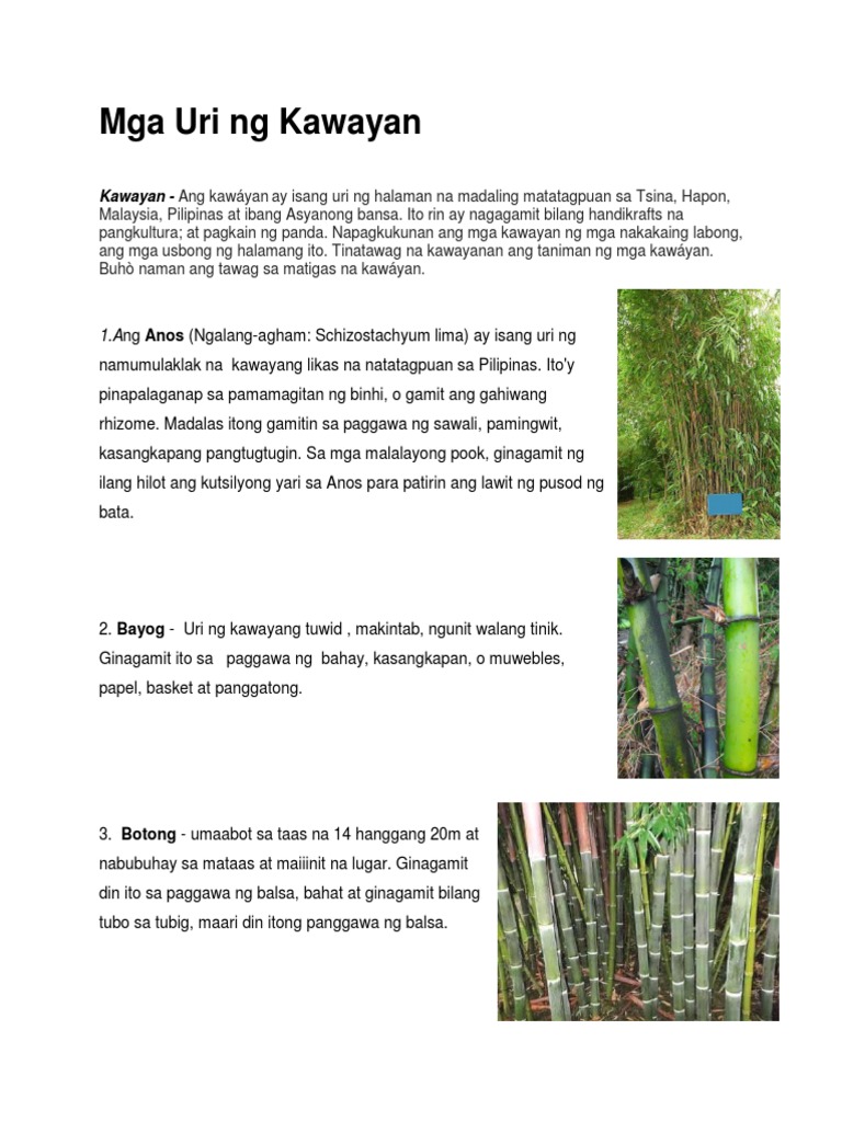 Ito ay walang tinik at makinis. Ctto URI NG KAWAYAN 1. Bayog ito ay isang uri ng kawayan na pinakamakunat tuwid makintab at walang tinik kung kaya ito ay ginagawang panghaligi sa mga tahanan noon o ng isang bahay kuboAt panggawa ng mga muebles.